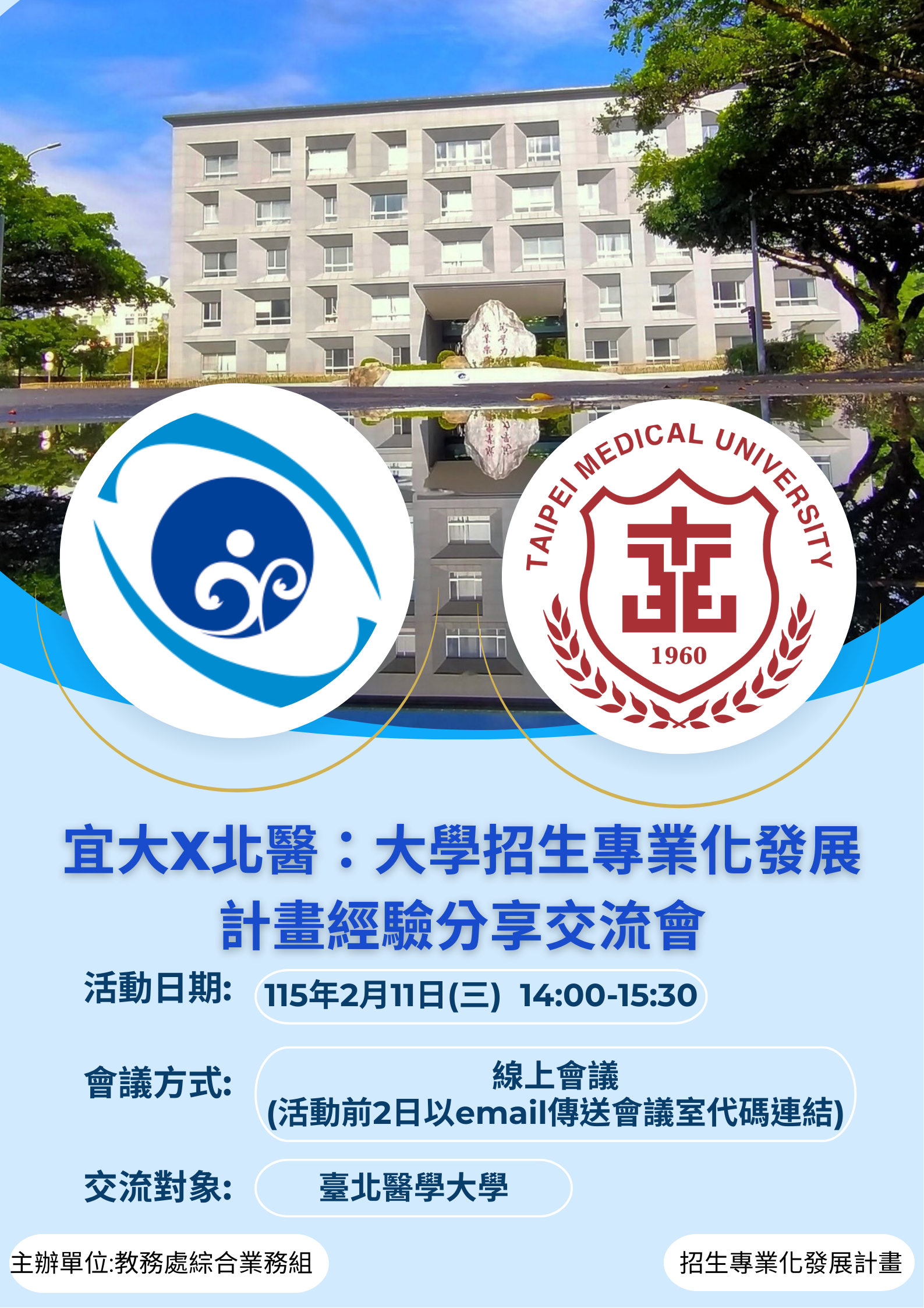 【大學交流】「宜大X北醫:大學招生專業化發展計畫經驗分享交流會」,敬邀各位師長踴躍報名參與!